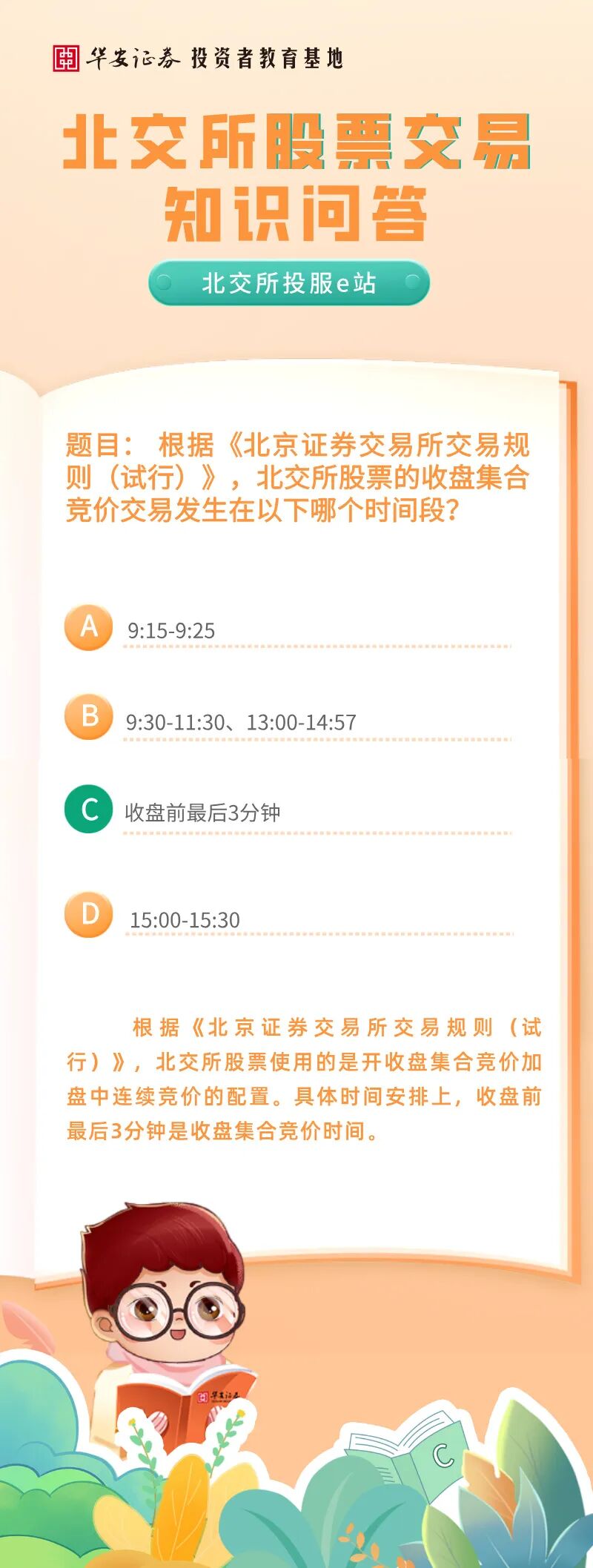 北交所投服e站 | 北交所股票交易知识问答:北交所股票的收盘集合竞价交易发生在以下哪个时间段?来源:华安证券投教基地 | 作者: | 发表于:2025/12/30 | 阅读量:722636 |