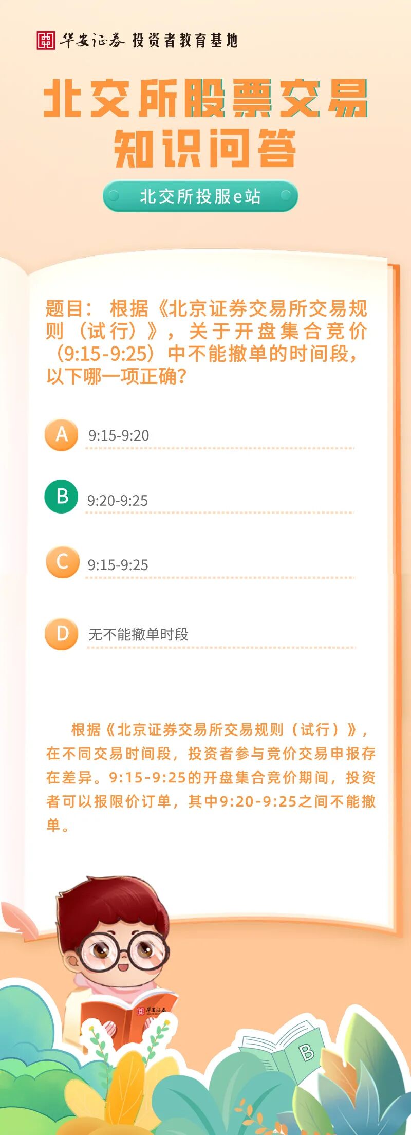 北交所投服e站 | 北交所股票交易知识问答:关于开盘集合竞价(9:15-9:25)中不能撤单的时间段,以下哪一项正确?来源:华安证券投教基地 | 作者: | 发表于:2025/12/30 | 阅读量:693359 |