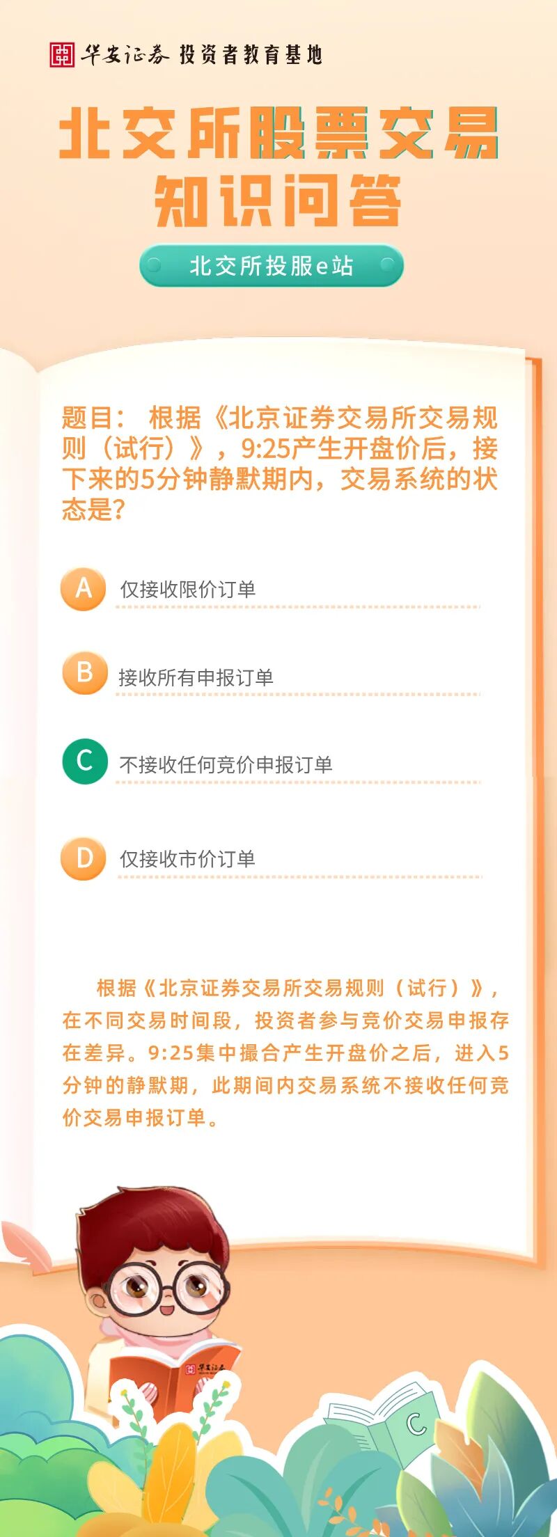北交所投服e站 | 北交所股票交易知识问答:关于开盘价后的静默期,以下哪一项正确表述了交易系统状态?来源:华安证券投教基地 | 作者: | 发表于:2026/1/9 | 阅读量:865277 |