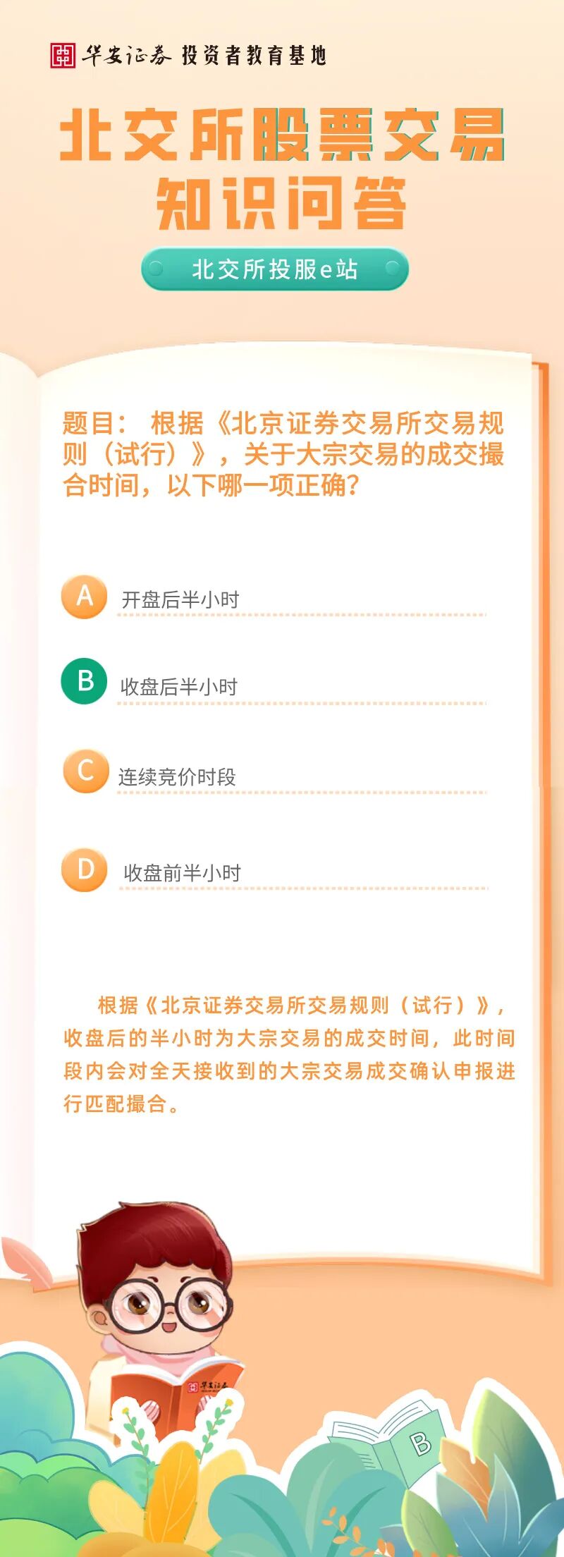 北交所投服e站 | 北交所股票交易知识问答:关于大宗交易的成交撮合时间,以下哪一项正确?来源:华安证券投教基地 | 作者: | 发表于:2026/1/9 | 阅读量:695435 |