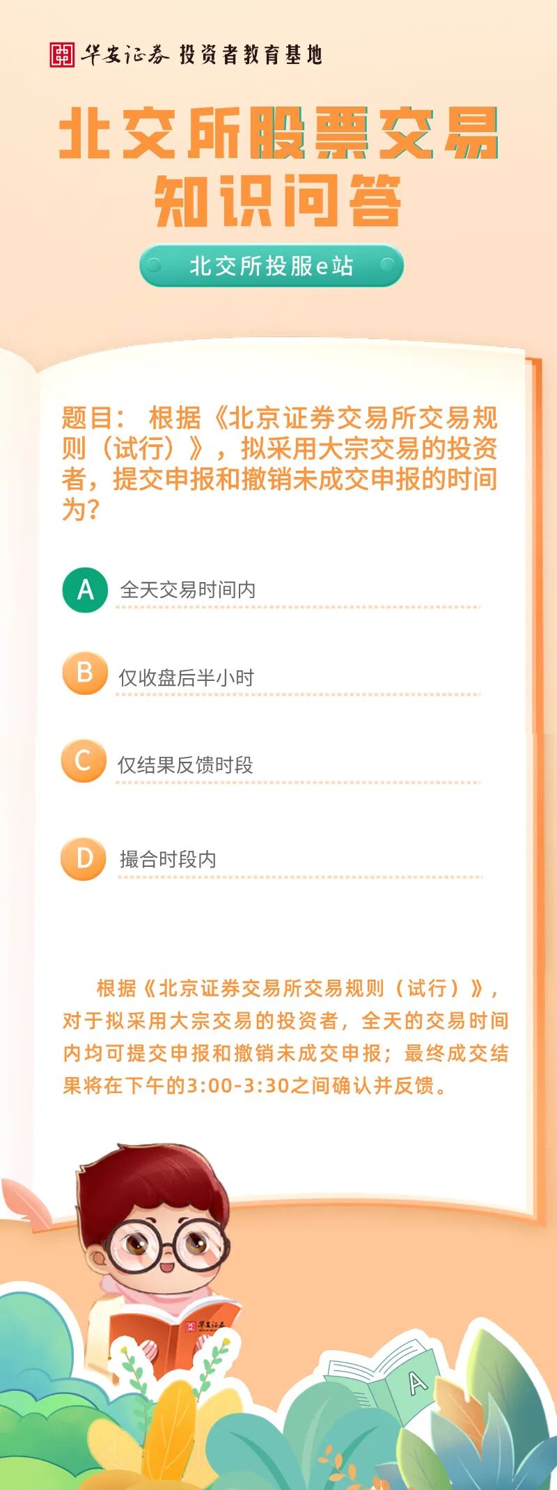 北交所投服e站 | 北交所股票交易知识问答:关于大宗交易提交申报和撤销未成交申报的时间,以下哪一项正确?来源:华安证券投教基地 | 作者: | 发表于:2026/1/9 | 阅读量:713519 |