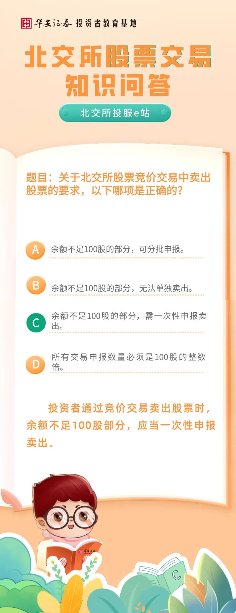 北交所投服e站 | 北交所股票交易知识问答:关于北交所股票竞价交易中卖出股票的要求,以下哪项是正确的?来源:华安证券投教基地 | 作者: | 发表于:2026/1/21 | 阅读量:603541 |