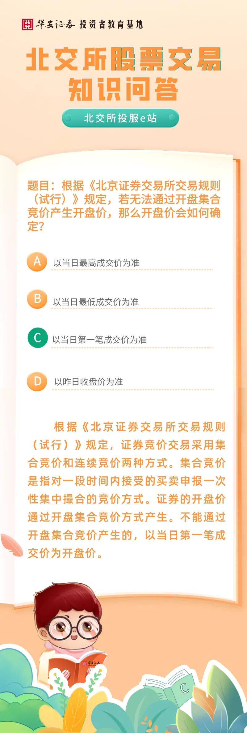 北交所投服e站 | 北交所股票交易知识问答:若无法通过开盘集合竞价产生开盘价,那么开盘价会如何确定?来源:华安证券投教基地 | 作者: | 发表于:2026/1/21 | 阅读量:723476 |