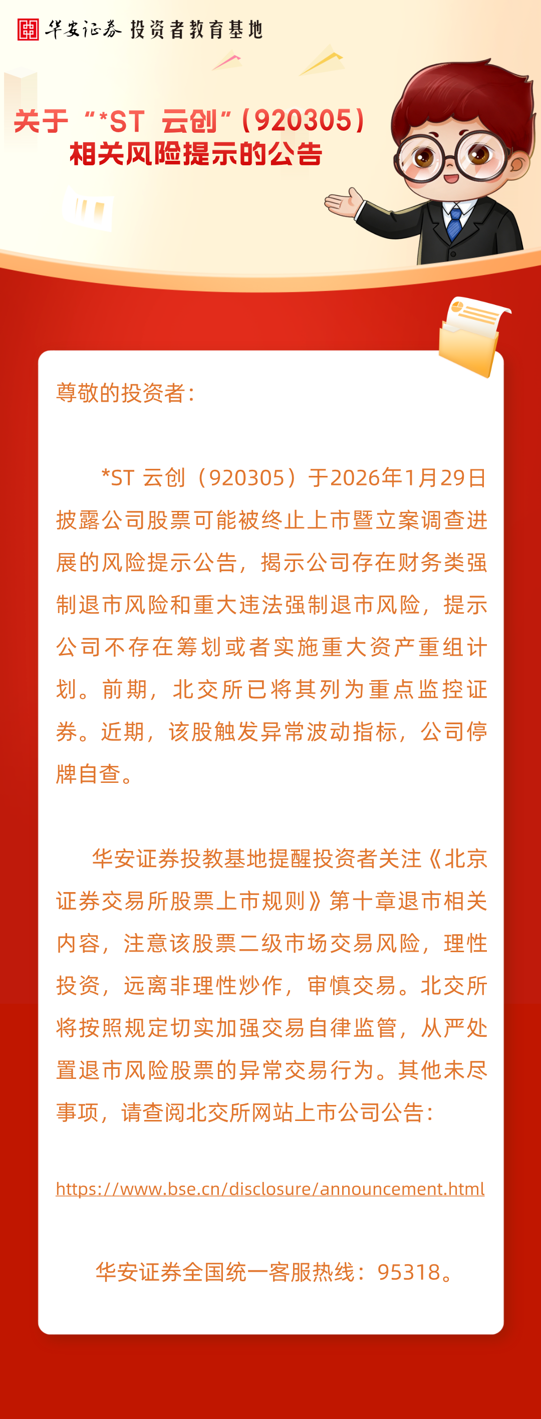风险提示 | 关于“*ST 云创”(920305) 相关风险提示的公告来源:华安证券投教基地 | 作者: | 发表于:2026/2/13 | 阅读量:674052 |