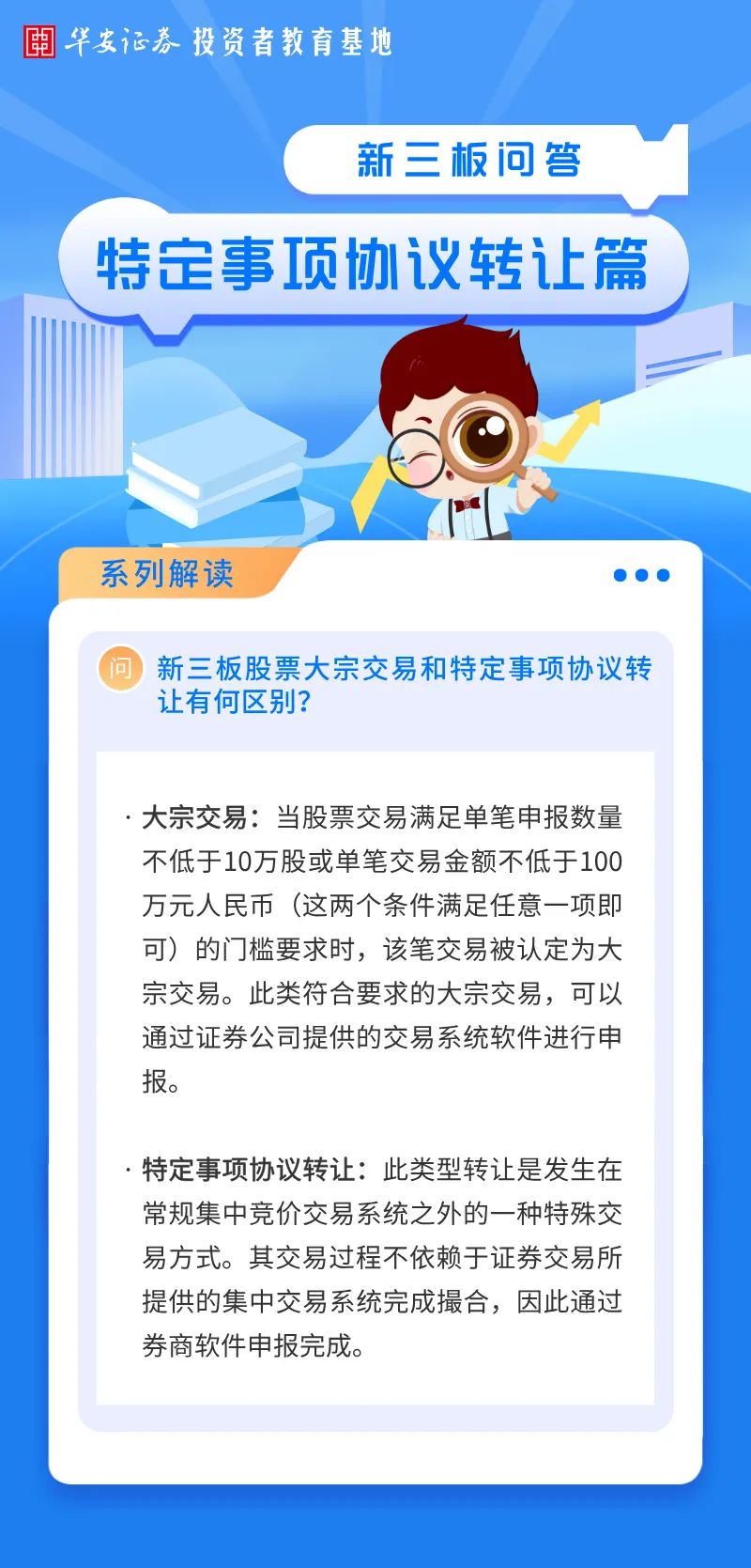 华小安惠学习 | 新三板特定事项协议转让篇知识问答:新三板股票大宗交易和特定事项协议转让有何区别?来源:华安证券投教基地 | 作者: | 发表于:2025/7/7 | 阅读量:994619 |