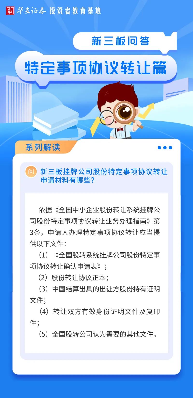 华小安惠学习 | 新三板特定事项协议转让篇知识问答:新三板挂牌公司股份特定事项协议转让申请材料有哪些?来源:华安证券投教基地 | 作者: | 发表于:2025/7/21 | 阅读量:816076 |
