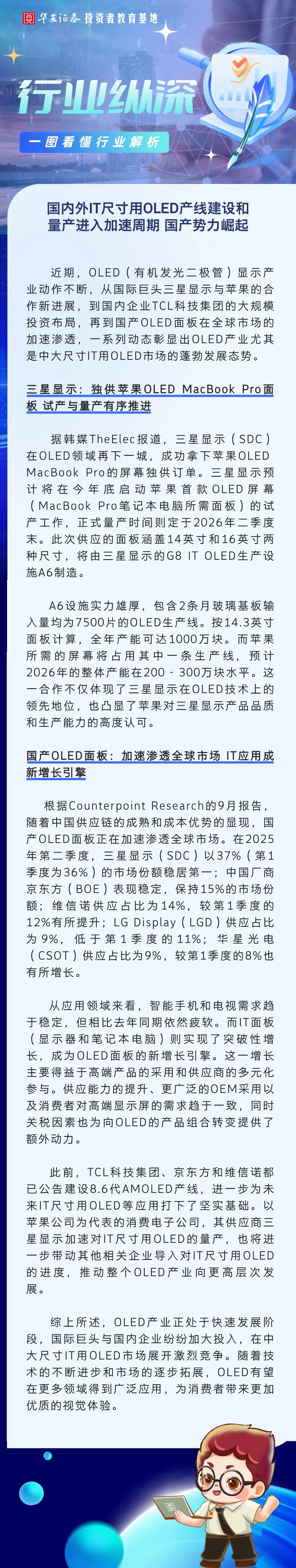 行业纵深 | 国内外IT尺寸用OLED产线建设和量产进入加速周期 国产势力崛起来源:华安证券投教基地 | 作者: | 发表于:2025/9/22 | 阅读量:919362 |