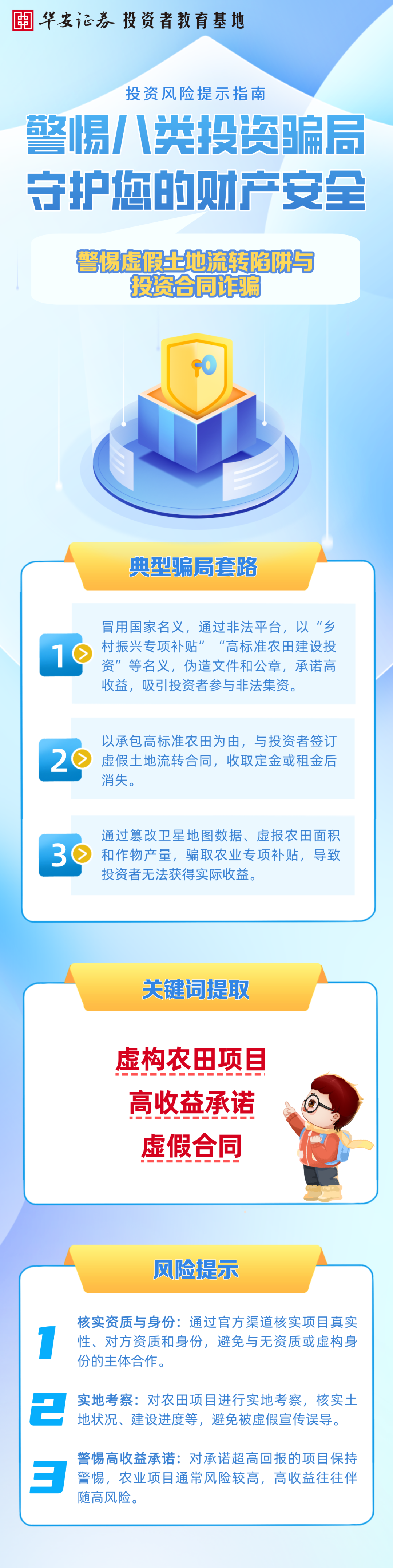 【国庆特辑】投教防非 | 投资风险提示指南:警惕虚假土地流转陷阱与投资合同诈骗来源:华安证券投教基地 | 作者: | 发表于:2025/10/2 | 阅读量:804817 |