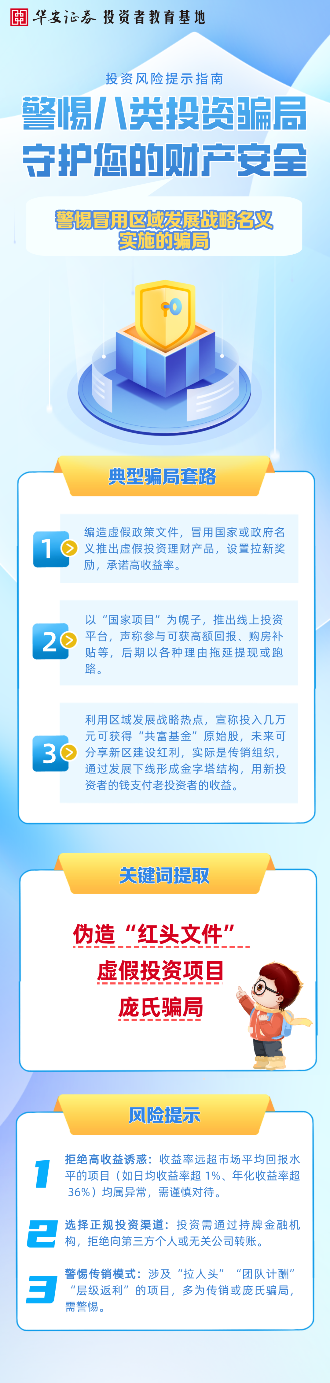 【国庆特辑】投教防非 | 投资风险提示指南:警惕冒用区域发展战略名义实施的骗局来源:华安证券投教基地 | 作者: | 发表于:2025/10/5 | 阅读量:800161 |
