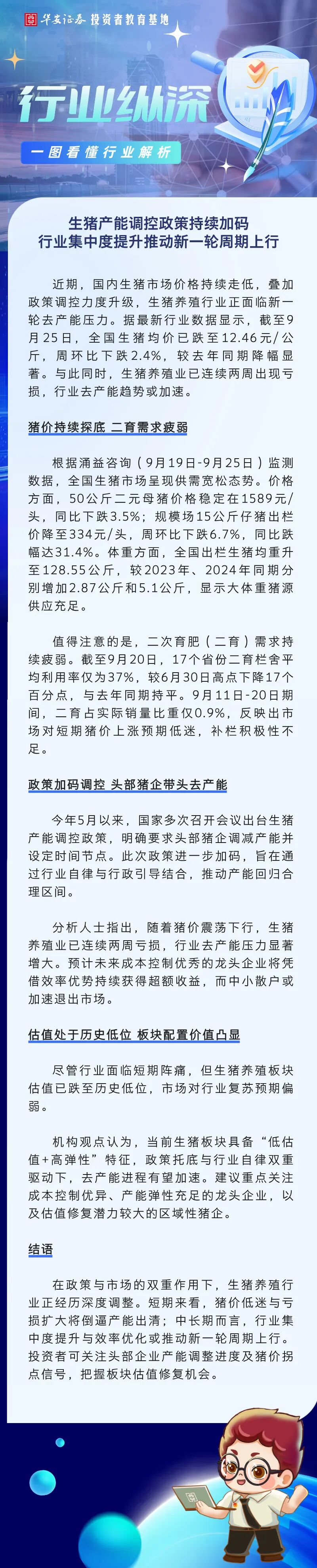 行业纵深 | 生猪产能调控政策持续加码 行业集中度提升推动新一轮周期上行来源:华安证券投教基地 | 作者: | 发表于:2025/10/17 | 阅读量:867096 |