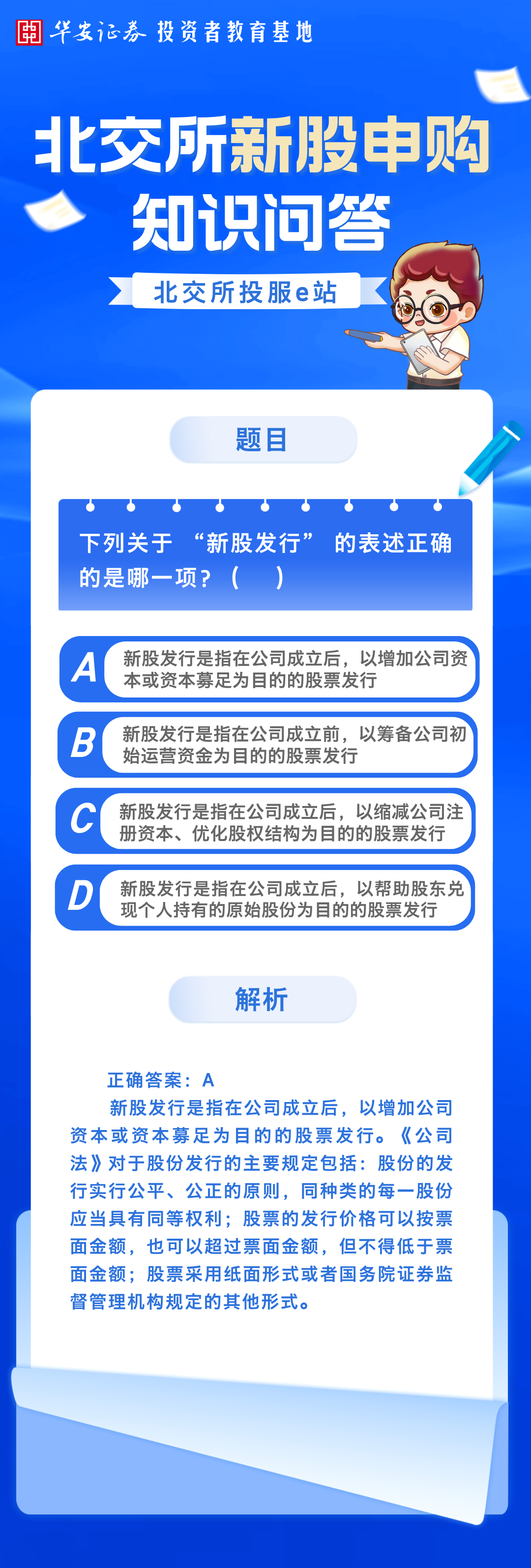 北交所投服e站 | 北交所新股申购知识问答:关于 “新股发行”的表述正确的是哪一项?来源:华安证券投教基地 | 作者: | 发表于:2025/10/17 | 阅读量:873641 |