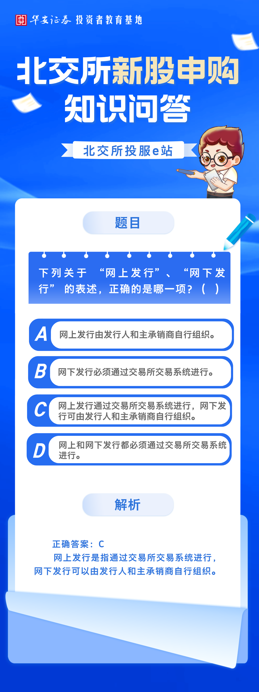 北交所投服e站 | 北交所新股申购知识问答:关于“网上发行”、“网下发行”表述正确的是哪一项?来源:华安证券投教基地 | 作者: | 发表于:2025/10/28 | 阅读量:855666 |