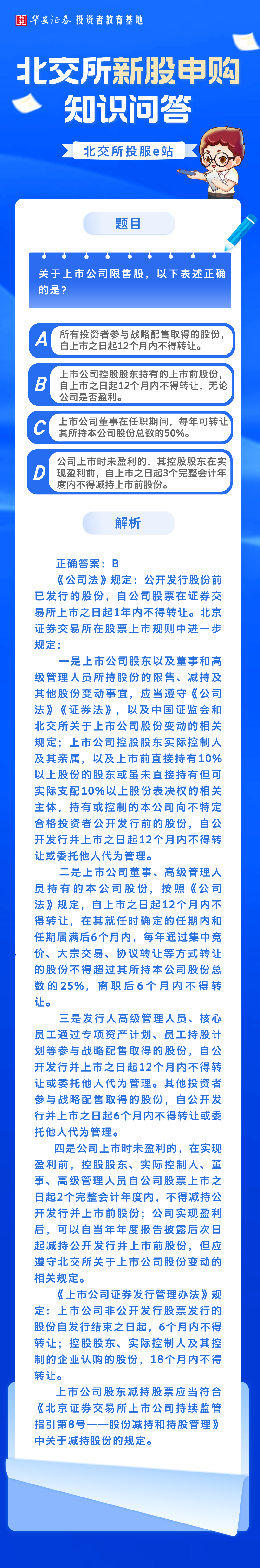北交所投服e站 | 北交所新股申购知识问答:关于北交所股份限售安排,表述正确的是?来源:华安证券投教基地 | 作者: | 发表于:2025/11/12 | 阅读量:819893 |