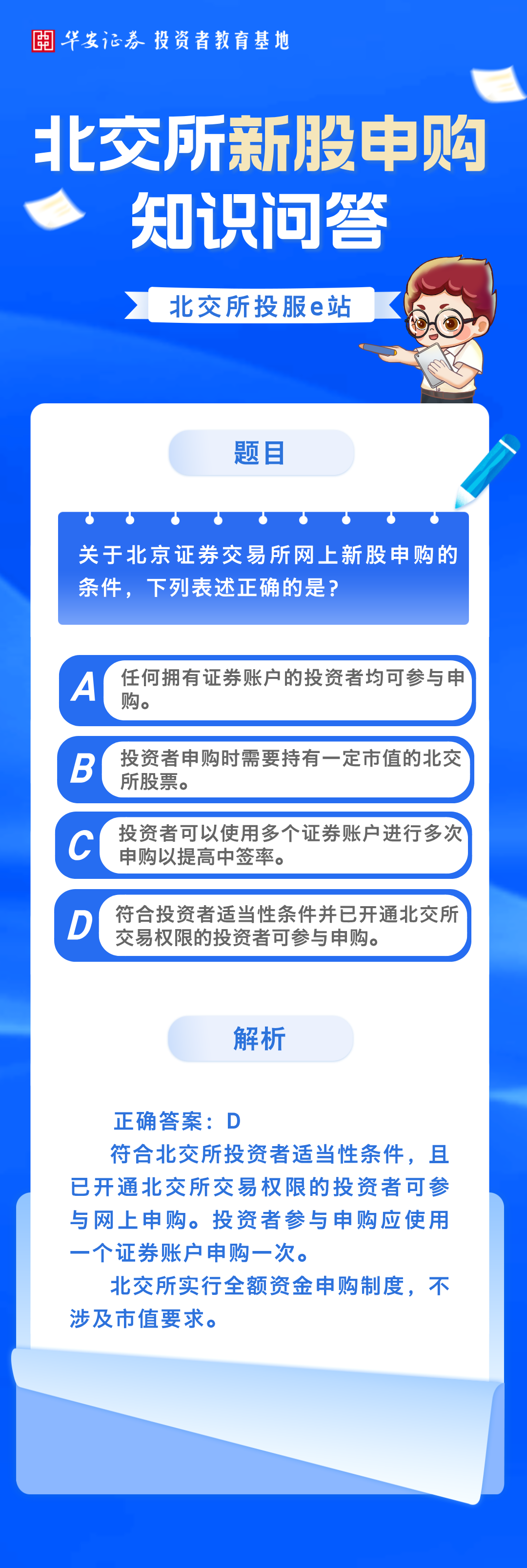 北交所投服e站 | 北交所新股申购知识问答:关于北京证券交易所网上新股申购的条件,表述正确的是?来源:华安证券投教基地 | 作者: | 发表于:2025/11/26 | 阅读量:805403 |