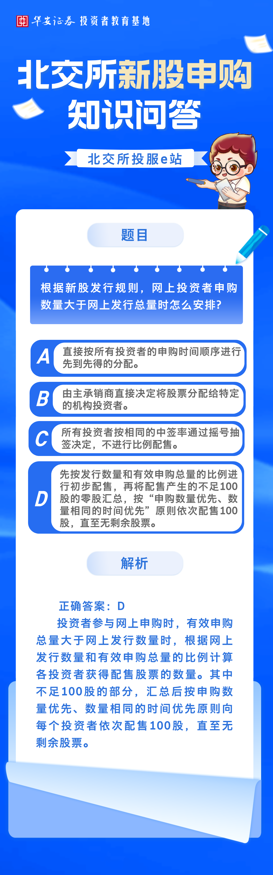 北交所投服e站 | 北交所新股申购知识问答:网上投资者申购数量大于网上发行总量时怎么安排?来源:华安证券投教基地 | 作者: | 发表于:2025/11/26 | 阅读量:796529 |