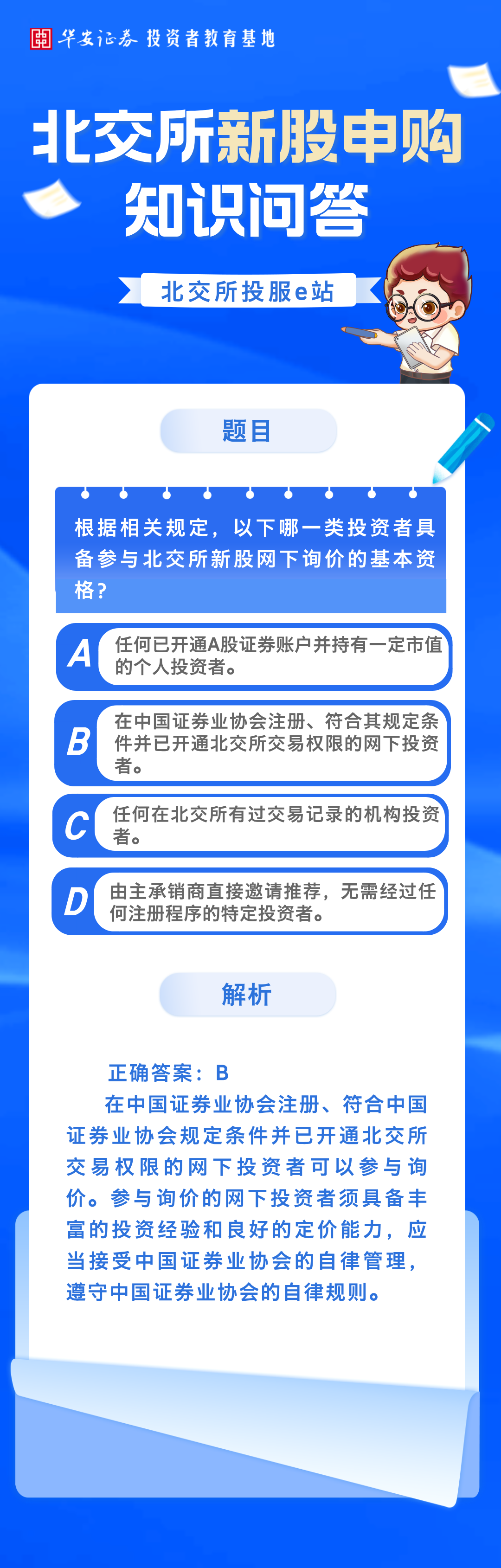 北交所投服e站 | 北交所新股申购知识问答:以下哪一类投资者具备参与北交所新股网下询价的基本资格?来源:华安证券投教基地 | 作者: | 发表于:2025/11/26 | 阅读量:805853 |