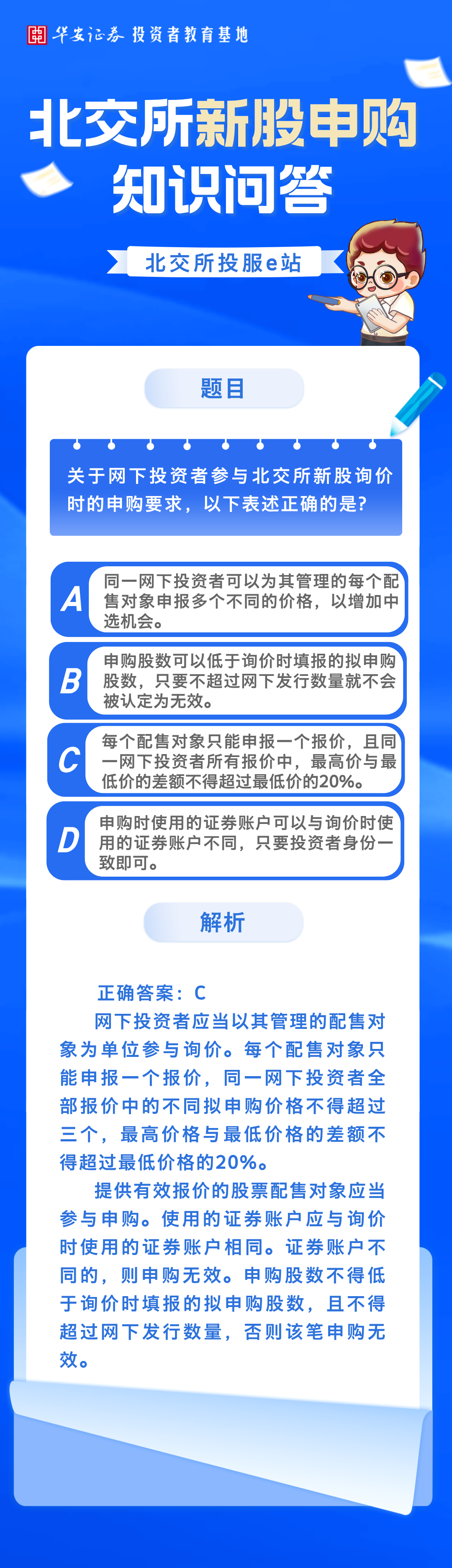 北交所投服e站 | 北交所新股申购知识问答:关于网下投资者参与北交所新股询价时的申购要求,以下表述正确的是?来源:华安证券投教基地 | 作者: | 发表于:2025/11/26 | 阅读量:809096 |