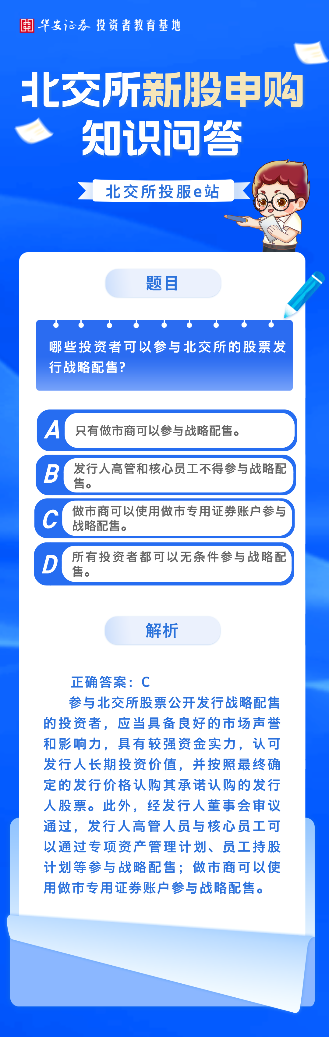 北交所投服e站 | 北交所新股申购知识问答:哪些投资者可以参与北交所的股票发行战略配售?来源:华安证券投教基地 | 作者: | 发表于:2025/11/26 | 阅读量:806798 |