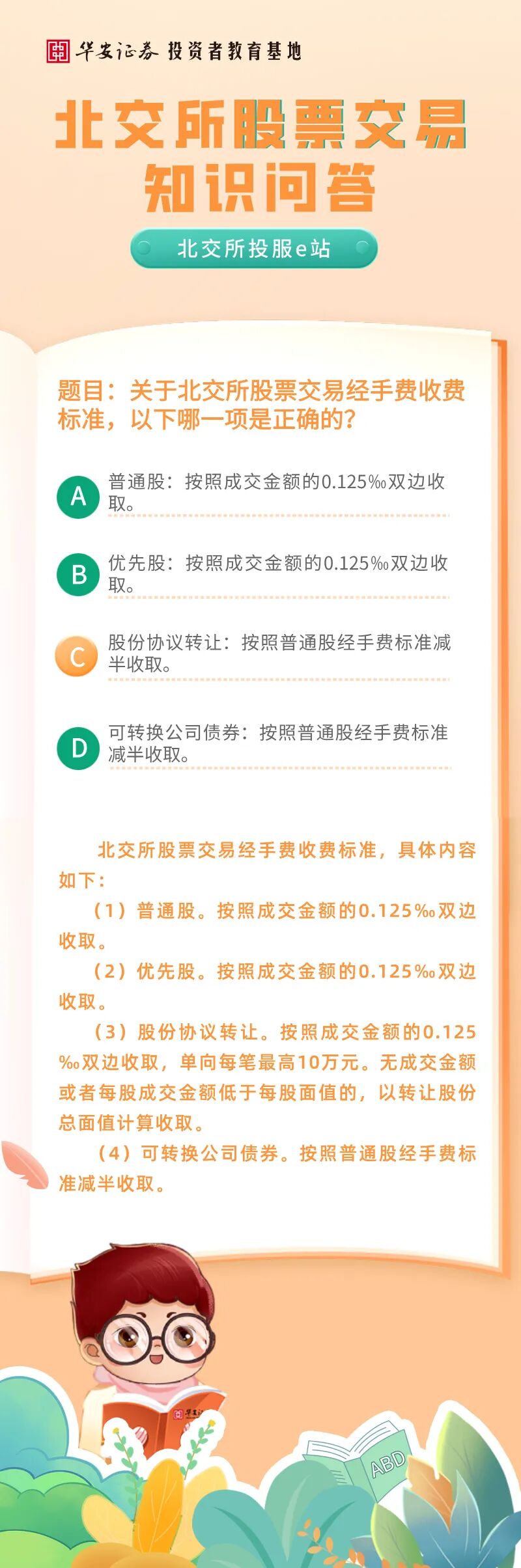 北交所投服e站 | 北交所股票交易知识问答:关于北交所股票交易经手费收费标准,以下哪一项是正确的?来源:华安证券投教基地 | 作者: | 发表于:2025/12/30 | 阅读量:776839 |